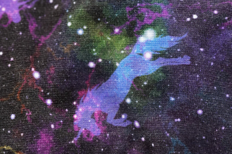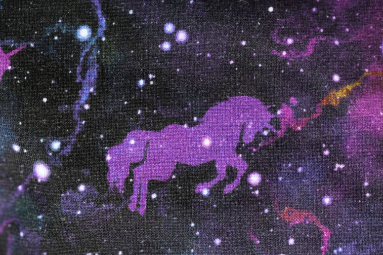 Wróćmy jednak do jednorożców. W końcu wygrały, jako znajdujące się na pograniczu wzorów rodem nieco z dziecinnego pokoju (jak dinozaury Dinos, czy rakiety i planety Space) i tych bardziej, nomen omen, uniwersalnych, w których czułabym się równie dobrze, gdyby zdobiły bardziej „poważne” ubranie (spodnie w jednorożce? Natychmiast!). Do tego są po prostu urokliwe, zwłaszcza jeśli lubisz kosmos (i jednorożce) oraz „galaktyczną” paletę barwną złożoną z kolorów z rodziny aurora borealis.