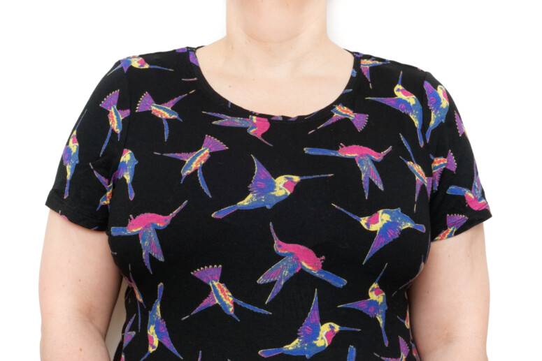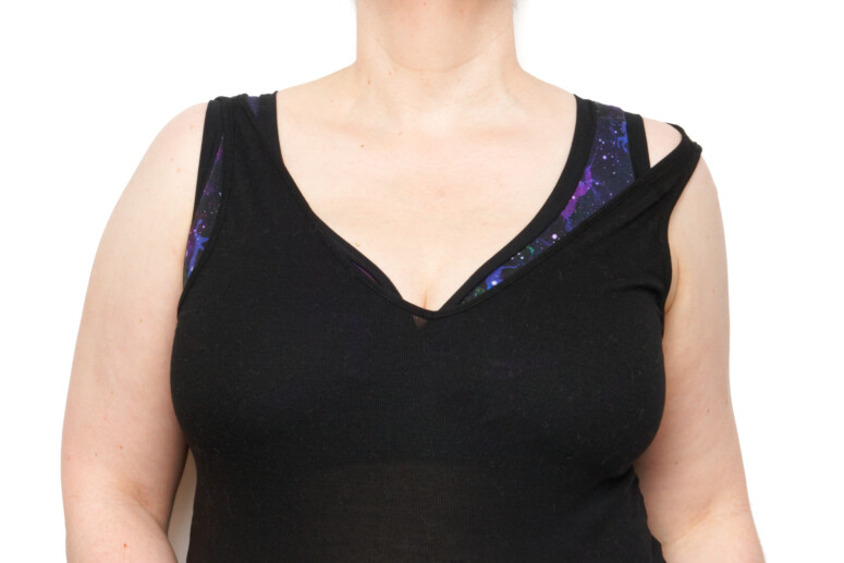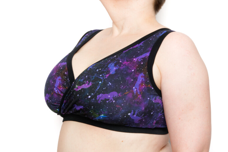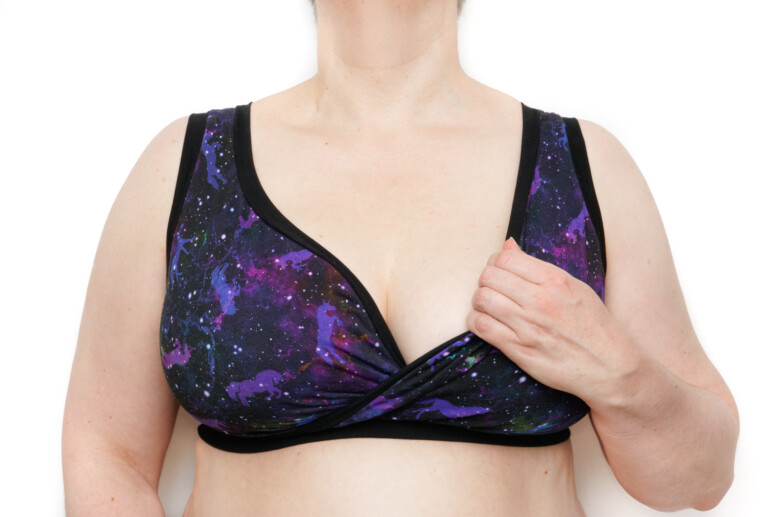 Original Molke to wciągany przez głowę (albo, jak kto woli, biodra – tego nie próbowałam, ale firma przygotowała instrukcję!) kopertowy top z przodem w postaci dwóch zachodzących na siebie trójkątów. Obie „miseczki” składają się z dwóch warstw materiału – mają czarną podszewkę.