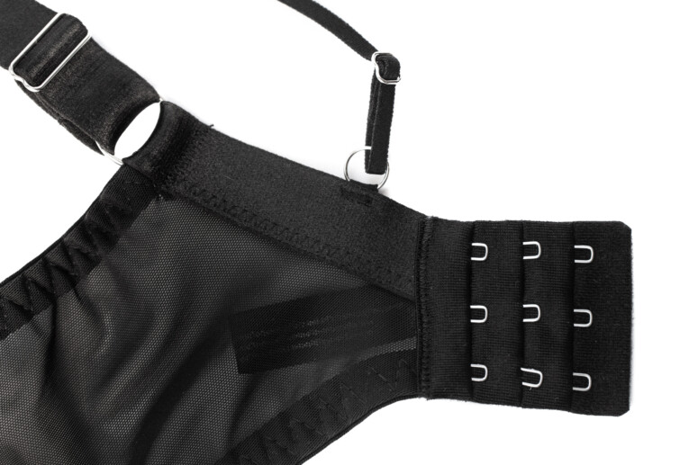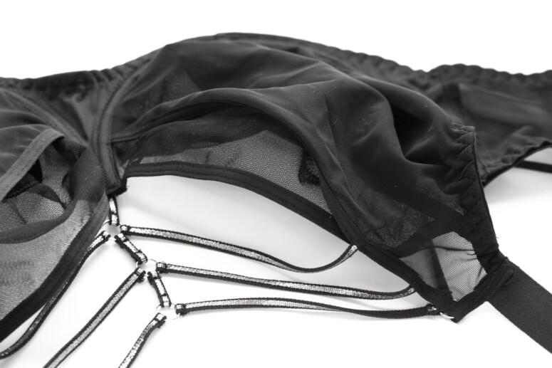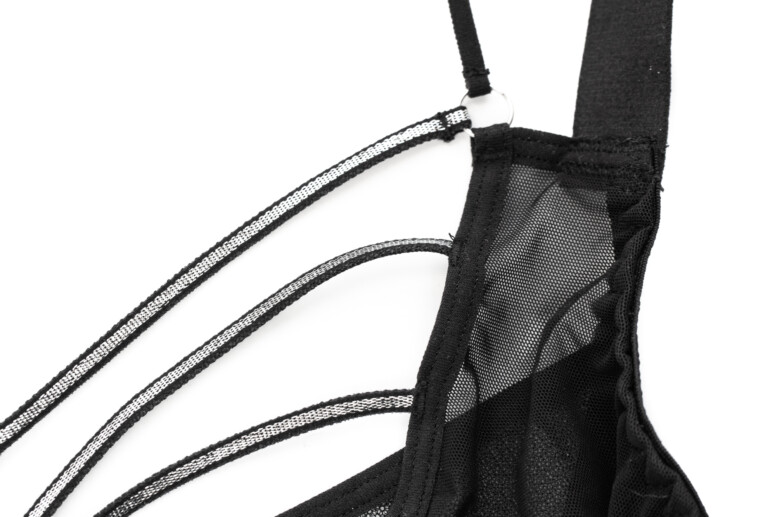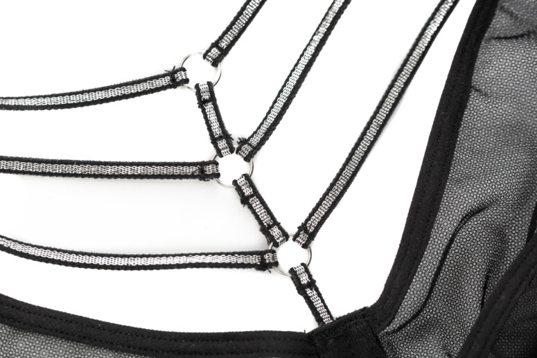 Wszystkie paseczki są elastyczne i dobrej jakości, raczej grube i solidne na tyle, na ile pozwala ich subtelna szerokość. Bardzo mi się podoba ta misterna sieć z kółkami w dekolcie. Widać tu trochę szwów i drobnych niteczek, ale trudno byłoby tego uniknąć – wybaczam.