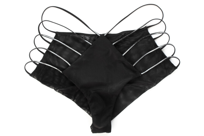 Ech, te majtkowe rozmiarówki… doszło do tego, że z radością odnotowałam fakt, że zakres rozmiarów brazylianów wcale nie jest mniejszy od fig (bo często tak bywa, że bardziej skąpe modele majtek mają mniej rozmiarów w myśl krzywdzącego założenia, że duże zadki nie lubią fikuśnych majtek). Moje XXL jednak pasuje i nie potrzeba mi więcej. Paseczki są elastyczniejsze od materiału, choć nie są elastyczne nadmiernie.