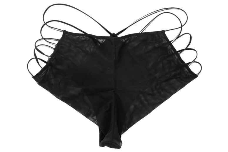 Konstrukcja tych majtek sprawia, że paski na ciele napinają się w równomiernym stopniu, nic nie wisi ani nie ucieka w dziwnych kierunkach. Oczywiście w noszeniu się przekręcają i trochę przesuwają, nie tworzą idealnie rozmieszczonej „drabinki”, ale zwyczajnie nie jest to możliwe. Lubię je nie tylko za paski, ale też za tę trójkątną formę zarówno z przodu, jak i z tyłu.