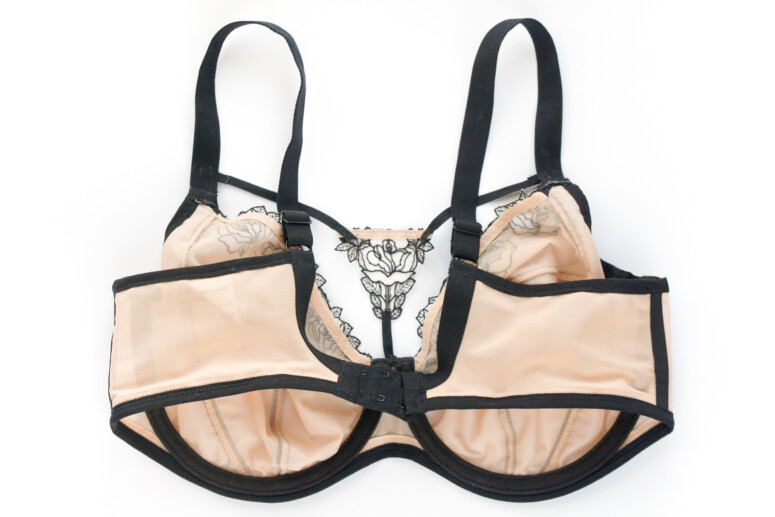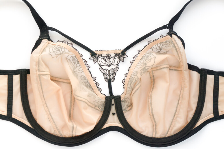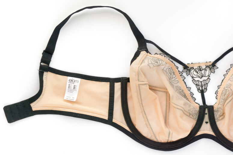 Z konstrukcją miseczek mam tylko jeden problem – jak zauważyłyście zapewne na zdjęciach, krawędzie miseczek trochę wcinają mi się w biust, a ich górna część się marszczy w okolicy mostka, zwłaszcza wierzchnia warstwa z haftem, najbardziej na mojej mniejszej piersi. Efekt ten nie dał się zniwelować zmianą rozmiaru. Modele typu plunge marki Elomi często zachowują się u mnie podobnie. Chyba są przystosowane do mocniej rozstawionych biustów, co pewnie ma więcej sensu w większych rozmiarach pod biustem niż mój. Nie wpływa to jednak ani na komfort noszenia, ani na wygląd w ubraniu (nawet w przejrzystym topie – chyba że jest się stanikową perfekcjonistką o sokolim wzroku). Mostek jest dość szeroki, co na pewno docenią osoby o bardziej rozstawionych piersiach.