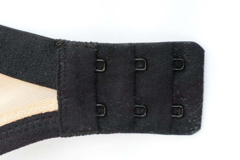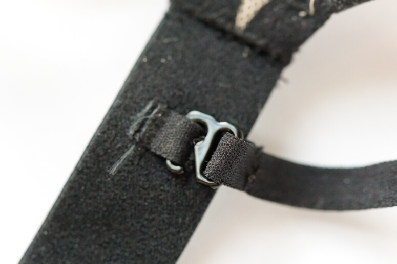 Pierwotnie paski były zrobione z czegoś w rodzaju łańcuszka, który zapinało się oczkami na miniaturowych guziczkach (widać go u mnie na instagramie na zdjęciu, które zrobiłam sobie na prezentacji kolekcji zeszłej zimy), co zapewniało regulację. Trochę szkoda, że firma z niego zrezygnowała na rzecz banalnych gumek, ale z drugiej strony – elastyczne paski przynajmniej nie będą odstawały ani zwisały, kiedy się schylę. Po łańcuszkowym pomyśle zostały tylko dwa guziczki na mostku. Paski mają haczyki dopinane do pętelek doszytych do ramiączek oraz na mostku. Nie są regulowane, ale są bardzo elastyczne i moim zdaniem można mieć nadzieję, że będą pasowały do każdego rozmiaru. Jedyne, czego mi brakuje, to możliwość umieszczenia tej dopinki wyżej, tak by mogła wyjrzeć nie tylko z najgłębszego dekoltu.