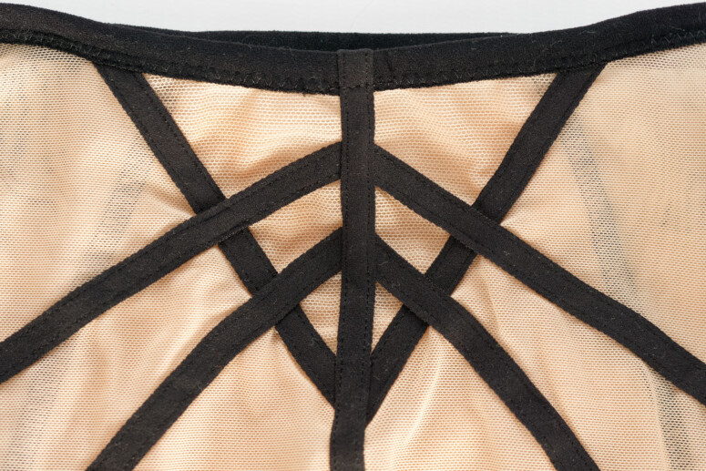 Siatka, z której uszyte są miseczki w części dolnej, jest gruba, gęsta i niestety nieprzejrzysta, na czym pewnie zyskuje solidność, przydająca się w naprawdę dużych rozmiarach (ja jestem blisko początku rozmiarówki, jeśli chodzi o ciężar biustu).