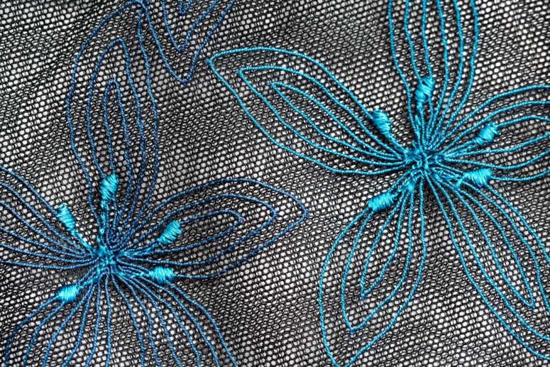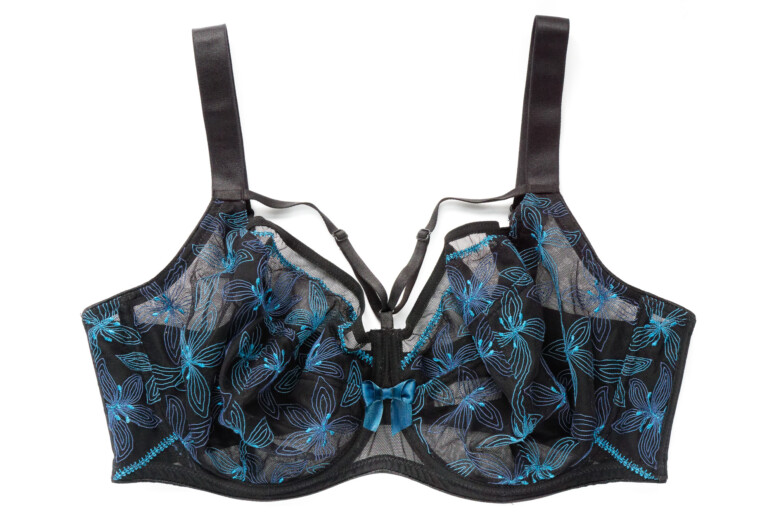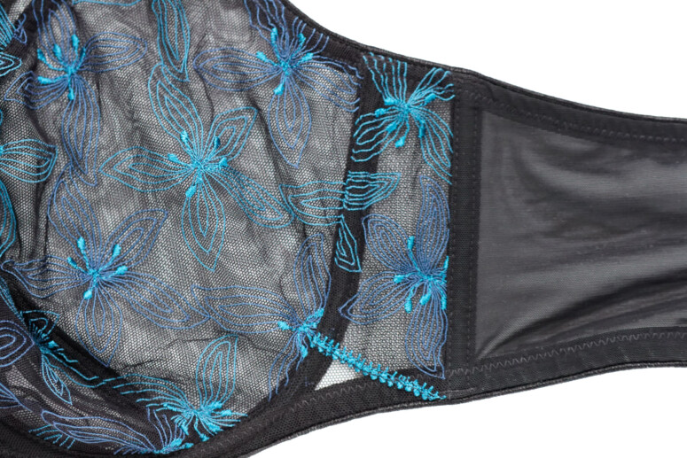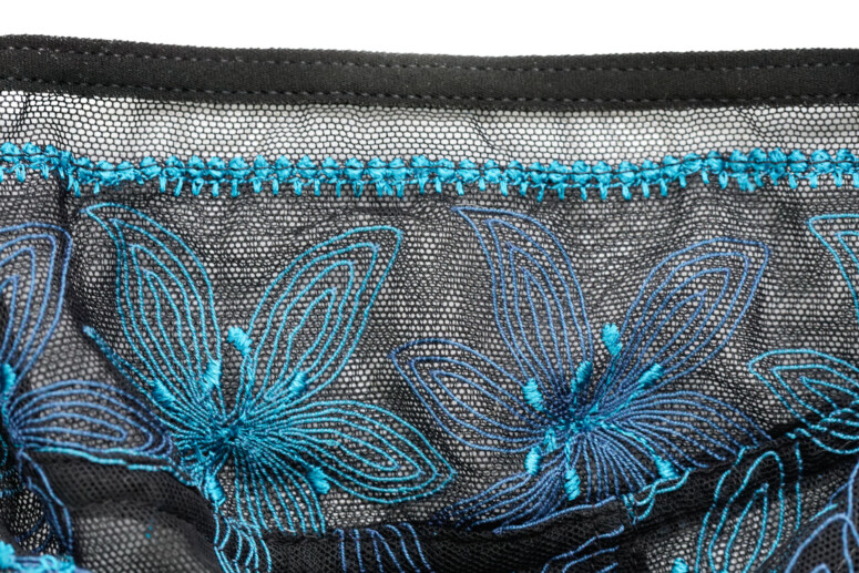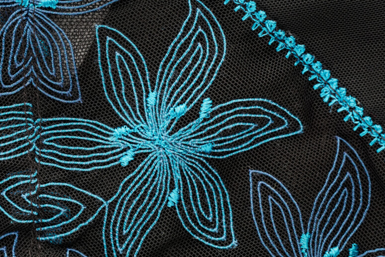 Ten haft na czarnym tle zachwycił mnie nie tylko kolorami (zwróćcie uwagę, że są dwa odcienie!), ale też precyzyjnymi liniami, jakimi narysowane są płatki kwiatów. Wzory te kojarzą mi się, pewnie przez te oceaniczne barwy, z płetwami rybek, albo wodorostami, czy innymi żyjątkami wodnymi. Udające kwiaty fosforyzujące stworzenia z morskich głębin zdobią niestety tylko przód biustonosza (oraz majtek) – za to wypełniają go bardzo dokładnie, bo również po bokach miseczek. Niestety sam tył pozostaje jednolicie czarny.