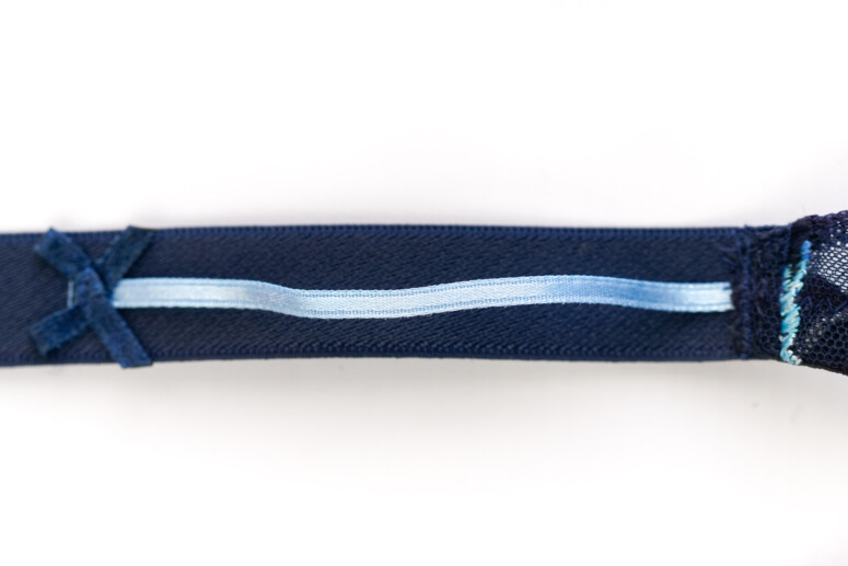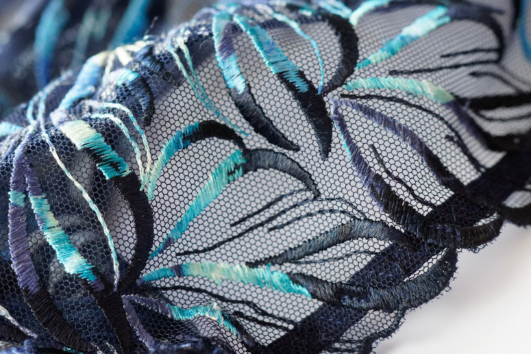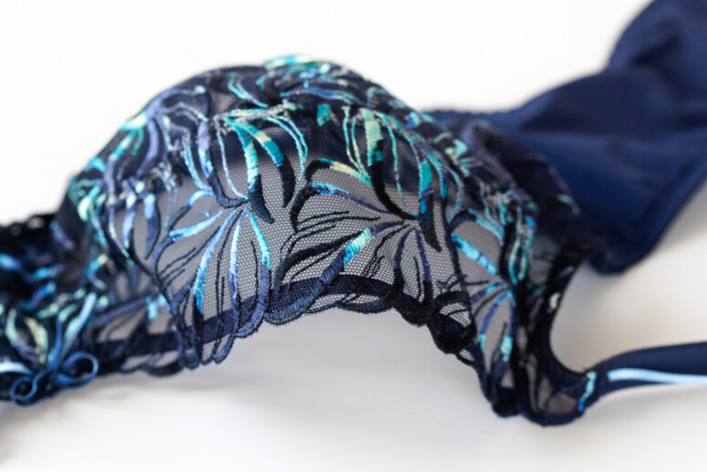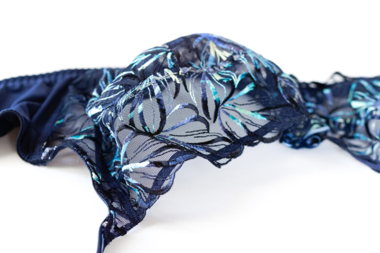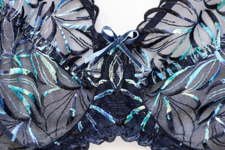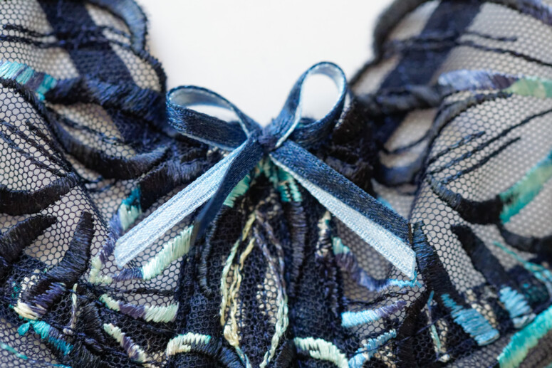 Ten haft jest boski, pewnie niewiele z Was zaprzeczy 😉 Kojarzy mi się z listkami albo płomykami, przyrodniczo i leśnie. Pokrywa calutkie miseczki i mostek – boków już nie, ale może to i dobrze, bo taka obfitość mogłaby nas przytłoczyć. Płomyczki są w kolorystyczne ombrowate przejścia od granatów, przez turkusy do kremów i żółci. Tłem jest granatowa siateczka. W dolnej części miseczek jest podszyta dodatkową warstwą, co jednak zmniejsza przejrzystość tylko trochę. Mora nie rzuca się w oczy, maskuje ją gęsty haft.