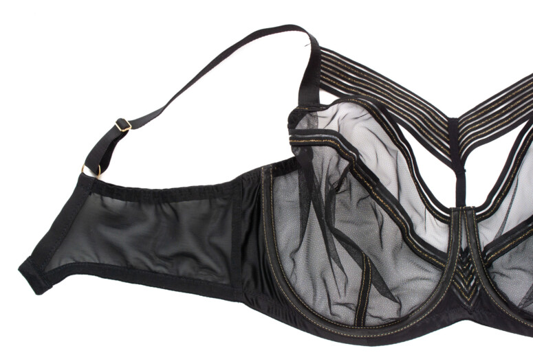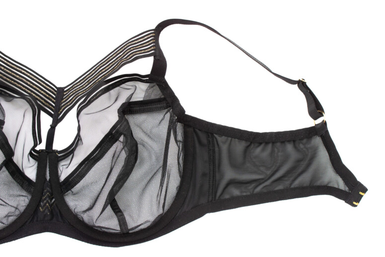 Niebanalny czarny biustonosz z paskami w dekolcie – tak, to jeszcze możliwe! ? W przypadku marki Novika – jak dotąd, wręcz obowiązkowe. Oprócz złota i pasiasto-trójkątnej geometrii w stylu art deco Lou Lou oferuje mega przejrzystość w wersji miękkiej stanika i mega lift w wersji półusztywnianej.