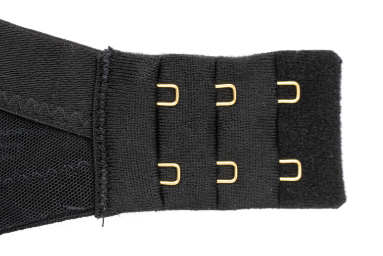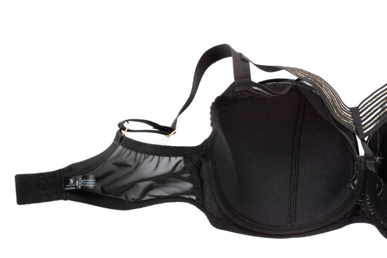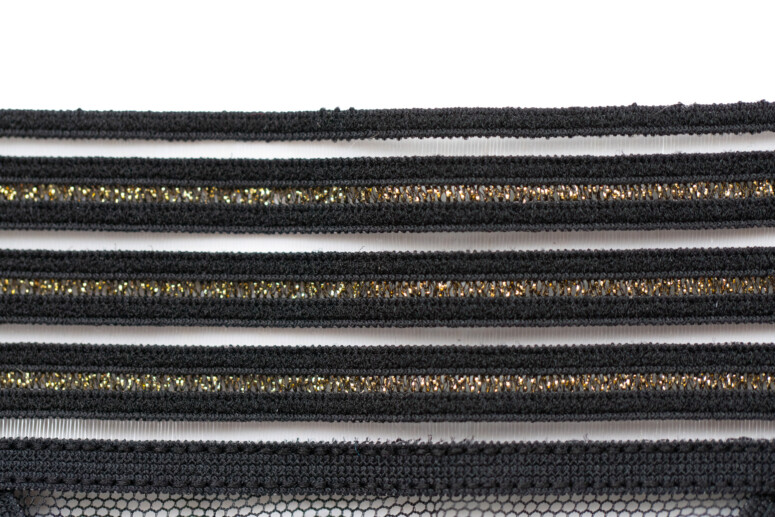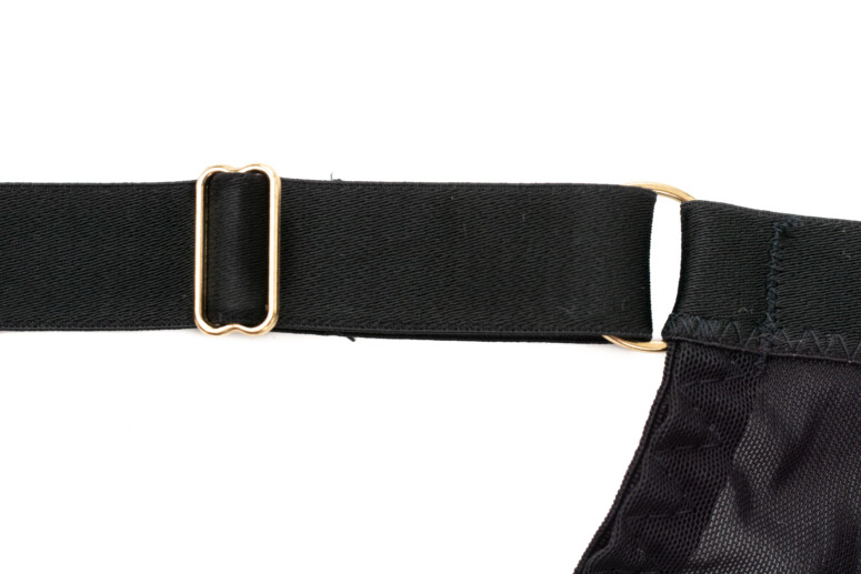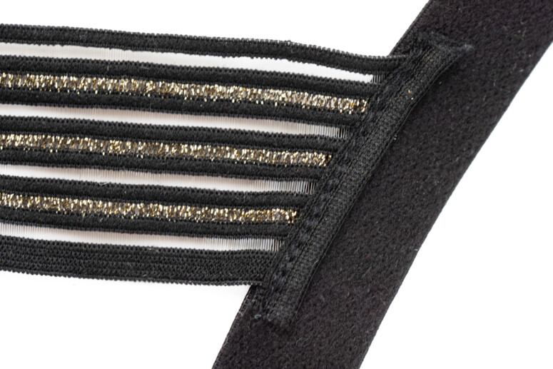 Pasek w dekolcie (obecny we wszystkich wersjach biustonosza) to szeroka, ażurowa taśma zdobiona metaliczną nicią, złożona z wielu równoległych pasków. Podobne, węższe taśmy zdobią stanik na krawędzi miseczki i na skośnym szwie.