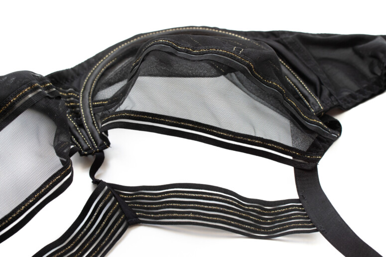 Jak widać na zdjęciach nabiustnych, cała Lou Lou jest mocno przejrzysta, mimo że dolna część miseczki jest z dwóch warstw tiulu. W wersji półusztywnianej jest tam oczywiście nieprzejrzysta pianka gorseciarska w kolorze beżowym, pokryta jedną warstwą tiulu. Co ciekawe jednak, od wewnętrznej strony stanika pianka ta jest czarna, co tworzy przyjemną jednolitość.