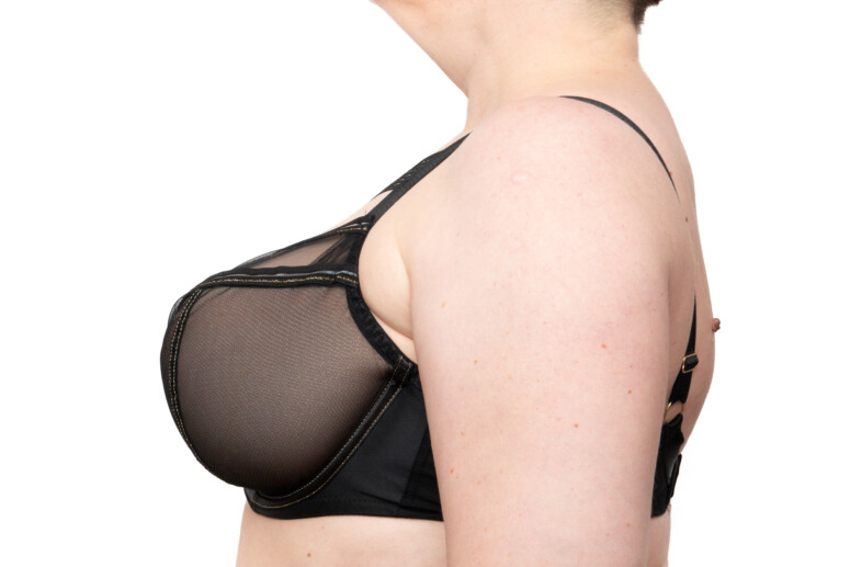 Wersja półusztywniana daje znany z tej konstrukcji mega lift i wyciąga piersi do przodu. Jeśli chcesz mocno wyeksponować biust, ale nie zależy ci aż tak na przejrzystości – w Lou Lou masz szansę wyglądać naprawdę spektakularnie. Na większej piersi widać u mnie wcinę krawędziową a.k.a lekką bułkę, ale w tzw. normalnym życiu, czyli bez solidnego wyprostu i pod ubraniem – jest gładko. Uważaj na ozdobną taśmę pośrodku miseczki – może się odznaczać, jeśli twoja pierś nie wypełni maksymalnie jej górnej części. W takim przypadku możesz potrzebować mniejszego niż zwykle rozmiaru.
