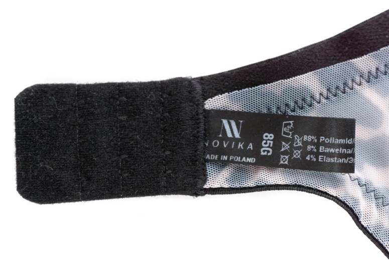 Jako entuzjastka biustonoszy z paseczkami jestem oczywiście uradowana podwójnie. Paski są solidne w dotyku, gładkie i połączone ze sobą w praktycznie niewidoczny sposób. Pośrodku tworzą trójkątny układ, który kojarzy mi się z modelem Triangle od Marlies Dekkers 🙂 (Noviko! Zostań polską Marlies!).