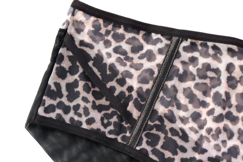 Ciut tylko byłam rozczarowana, że nie ma na nich więcej ozdobności – może przydałoby się jakieś opaseczkowanie u góry? Ale w sumie nie każdy lubi takie elementy, a jakieś nawiązanie do stanikowych ozdób jest: skośne paseczki po bokach, szwy wykończone satyną ze złotym przeszyciem. No i panterka nie tylko z przodu, ale i częściowo z tyłu. Wykończenie nogawek z tyłu miłe w noszeniu – złożony elastyczny tiul.