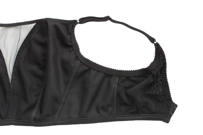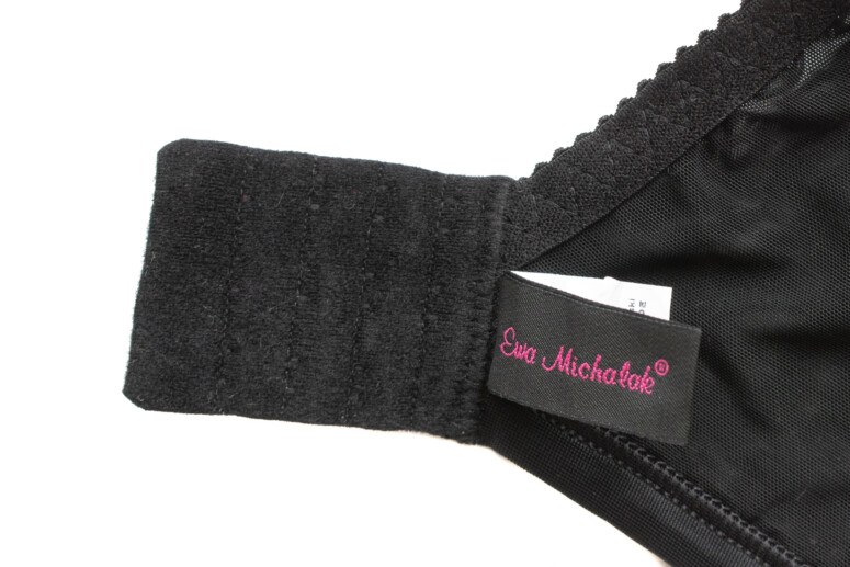 Jak widać, „miseczki” wraz z bokami są skrojone z 3 części połączonych pionowymi szwami, plus tiulowe okienko u góry na środku. Cały przód jest bardzo wysoki, ale boki podkrojone odpowiednio, tak by nie uwierały w okolice pachy. Top Sekret nie ma żadnych twardych elementów i jego zbierająco-podnoszące moce opierają się wyłącznie na odpowiednim kroju, zabudowaniu i bardzo stabilnych materiałach. Pierwsze skrzypce gra tu gruba i bardzo gęsta dzianina, z której uszyty jest cały przód. Tiulowa wstawka również jest nieelastyczna, choć siateczka oczywiście lekko się naddaje (górna krawędź wykończona jest gumką).