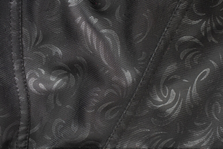 Top Sekret ma w sobie wiele ze stylu retro – lekko połyskująca żakardowa dzianina, spory tiulowy prześwit i oczywiście klasyczna czerń. W przeciwieństwie do bezfiszbinowych retrostaników jednak nie kształtuje piersi w nic podobnego do stożków, jest bowiem topem o słabo wyodrębnionych „miseczkach”. Dodatkowym nawiązaniem do tradycji jest szeroka satynowa lamówka na granicy dzianiny i tiulowego okienka pośrodku. Lubię takie widoczne połączenia materiałów, bo kojarzą mi się z misternym procesem szycia.