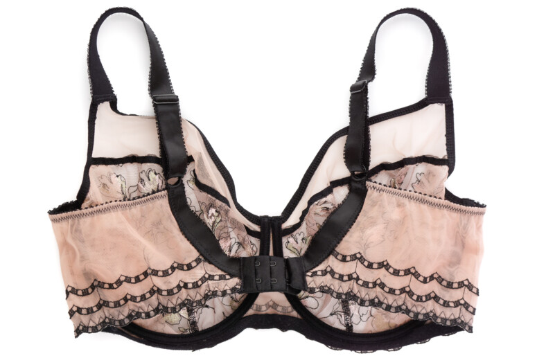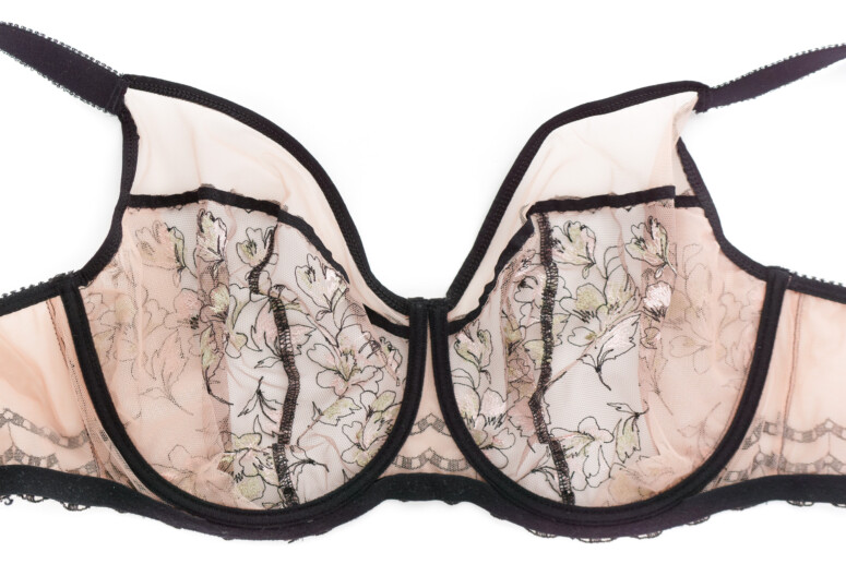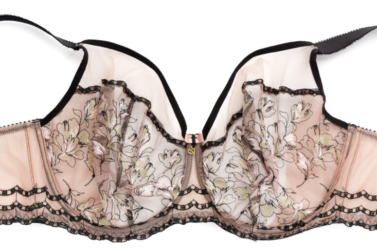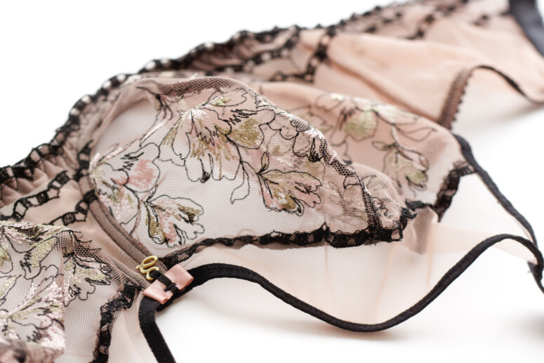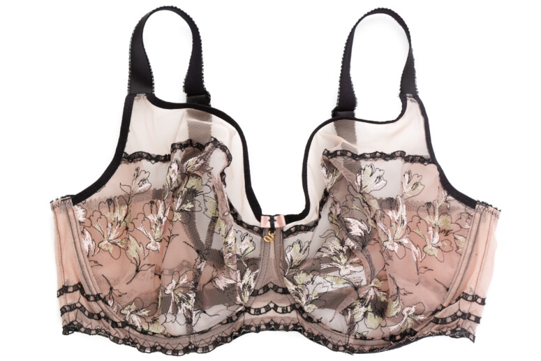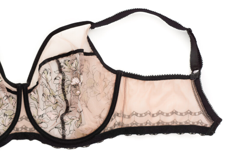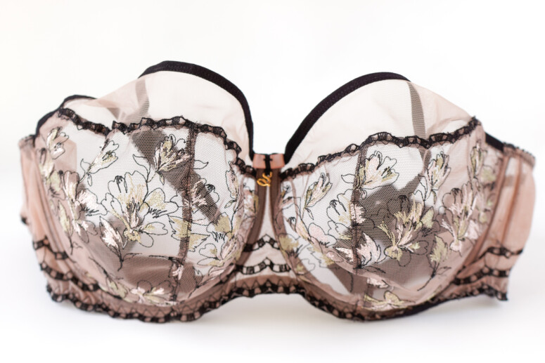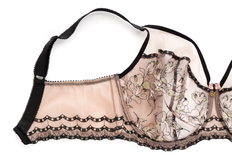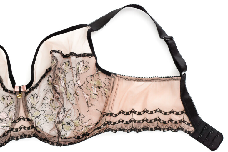 Celem było stworzenie konstrukcji z pionowym szwem na miseczkach, kojarzącej się wizualnie z half-cupem-balkonetką i podobnie jak ona zaokrąglającej biust, choć przy tym dobrze go kontrolującej i wyżej zabudowanej. Moim zdaniem cel został osiągnięty! Model wygląda lekko, jest przejrzysty, dobrze zbiera i zaokrągla. Zwróćcie uwagę na konstrukcję dolnej części miseczek – pionowy szew i boczny sling zbierający piersi, wszyty od wewnątrz.