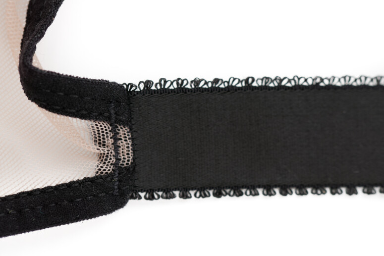 Górna część miseczek, która wizualnie zbliża całą formę do konstrukcji typu high-apex, jest, jak już wspomniałam, elastyczna, ale – co ważne dla podtrzymania – boczna krawędź od strony pachy jest w całości ustabilizowana nierozciągliwą taśmą. Elastyczne jest dopiero ramiączko, które zresztą zrobione jest z mało rozciągliwej gumy.
