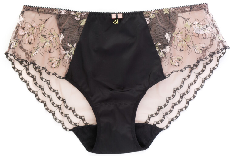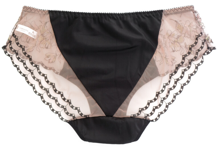 Najbardziej w tych majtkach podobają mi się nogawki wykończone haftem – wyglądają superefektownie, a gładkie krawędzie nie będą działały na nerwy zwolenniczkom no-VPL. W ogóle sam fakt, że jest tu tak dużo tiulu i haftu, nastraja mnie do tych fig pozytywnie, a do tego mają dobrą dla mnie wysokość. Ale już słyszę w głowie narzekania niektórych z Was na duże wstawki z czarnej dzianiny 😉 Rzeczywiście „panele skromnościowe” dość mocno rzucają się tu w oczy, są trochę ciężkie w zestawieniu z mgiełkowym stanikiem. Plus za kokardkę z inicjałem także na majtkach (Samanta szczyci się tym, że nie kupuje gotowych kokardek, tylko są one wytwarzane ręcznie na miejscu).