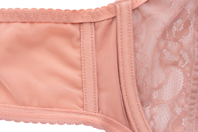 Tył stanika jest uszyty z dwóch warstw (powernet plus dzianina), co go wzmacnia, wciąż jednak pozostaje dosyć rozciągliwy, bo ten powernet jest cieniutki. Jeśli więc nie przepadasz za pancernikami, a wolisz miękkie, delikatne skrzydełka, Morelowa może Cię zadowolić. Ja akurat nie obrażam się ani o szerokie, ani nieco sztywniejsze tyły, lubię też szersze gumy – te należą raczej do wąskich. Zapięcie natomiast ma szerokość dla mnie optymalną.