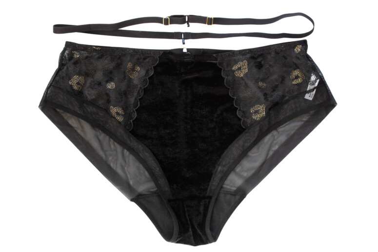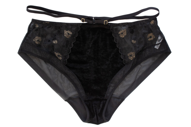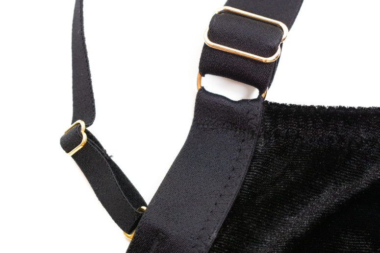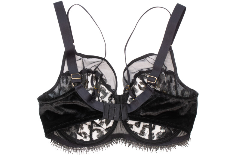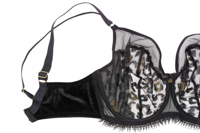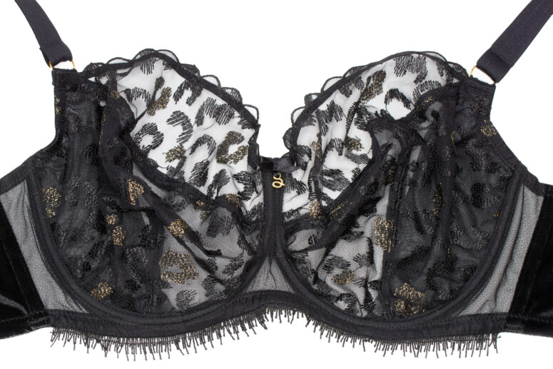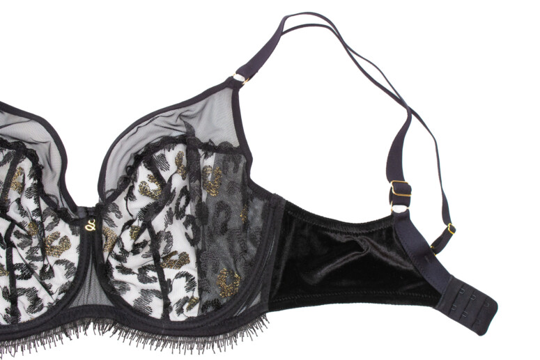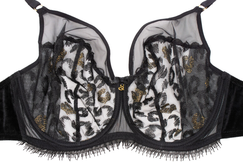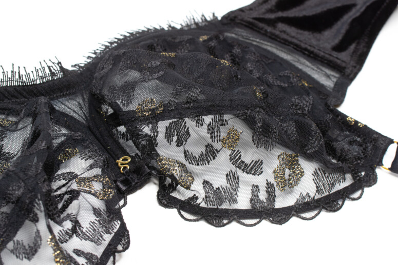 Nie da się ukryć, panterkę po prostu lubię. Jednak same cętki w czerni na czerni nie zrobiłyby na mnie już takiego wrażenia, gdyby nie to, że dodano tu całkiem pokaźną ilość złotych nici. Złote cętki pięknie się mienią, ale nie przytłaczają całości. Superciekawym pomysłem są doszyte u dołu frędzelki, które kojarzą mi się oczywiście z futrem, ale też z elegancką rzęskową koronką. W pierwszej chwili patrzyłam na nie sceptycznie, ale szybko się przekonałam, że świetnie pasują. Oraz, czy muszę mówić, że kocham welur? Aksamitne są całe boki i tył biustonosza, materiał jest mięsisty i miły w dotyku i nasuwa skojarzenie z ciepłem i miękkością kociego futerka, a także z wieczorową elegancją (wow, ale pean mi wyszedł! ?). W sam raz na… Sylwestra ?
