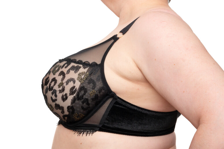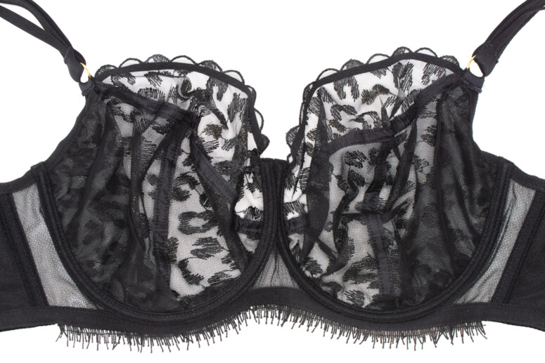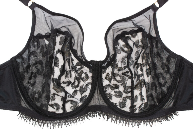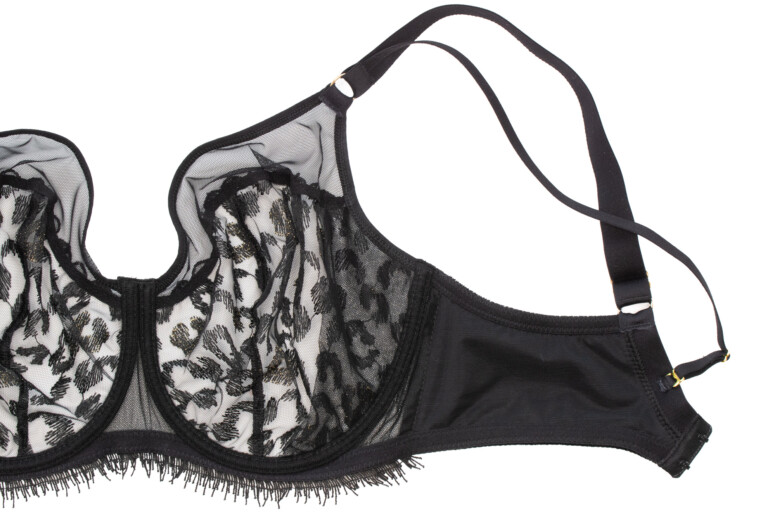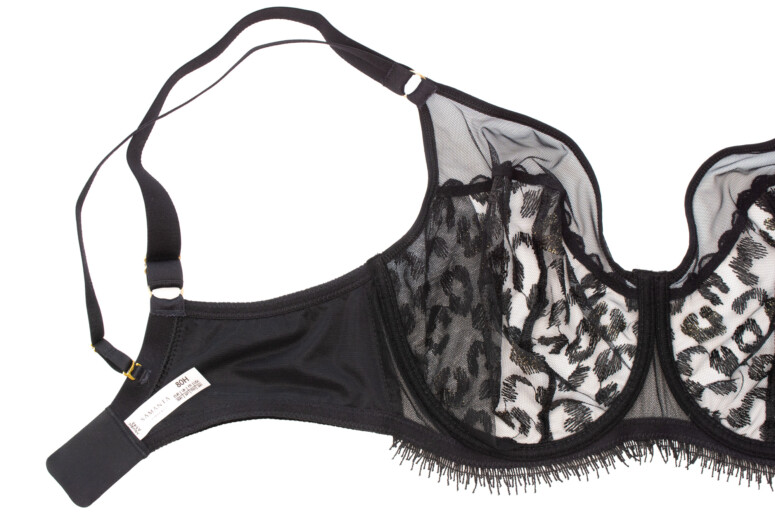 Uwielbiam też przejrzystość tego stanika – w modelu A143 miseczki są z pojedynczej warstwy tiulu (wyjątkiem jest wzmacniający panel boczny wszyty od środka). Górna część miseczek jest z gładkiej siateczki, dolna to haft. To jedna z przyczyn, dla których mając do wyboru A922 i A143 wybrałam jednak A143 – mimo że w A922 tych cudnych złotych cętek jest więcej, bo cała miseczka jest zrobiona z haftu! Przejrzysta jednak jest tylko od góry (dół to co najwyżej półprzejrzystość). Poniżej A922: