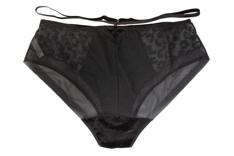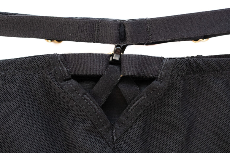 Figi są ekstra – mają i haft, i welurek, i sporo przejrzystości z tyłu i z boków, mają też „dopinacz” – paseczek z regulacją dołączany na haczykach do kółek pośrodku z przodu i z tyłu. Bardzo mi się podobają w wersji z tym dopiętym paseczkiem – moim zdaniem świetnie się prezentuje, szczególnie na grubszym tułowiu, fajnie też harmonizuje z dodatkowymi paseczkami w biustonoszu. Zaznaczam to, bo kiedyś miałam całkiem niesłuszne opory przed opasywaniem brzucha czymkolwiek, ale pokochałam estetykę podziału powierzchni ciała paskami i wręcz uważam, że im większe ciało, tym lepszy efekt. Paseczek przychodzi w komplecie z figami, ale nie jest obowiązkowy – możesz go odpiąć bez szkody dla atrakcyjności samych majtek. Z tyłu mają bardzo urocze, trójkątne okienko (najlepiej widoczne na fotkach napupnych).