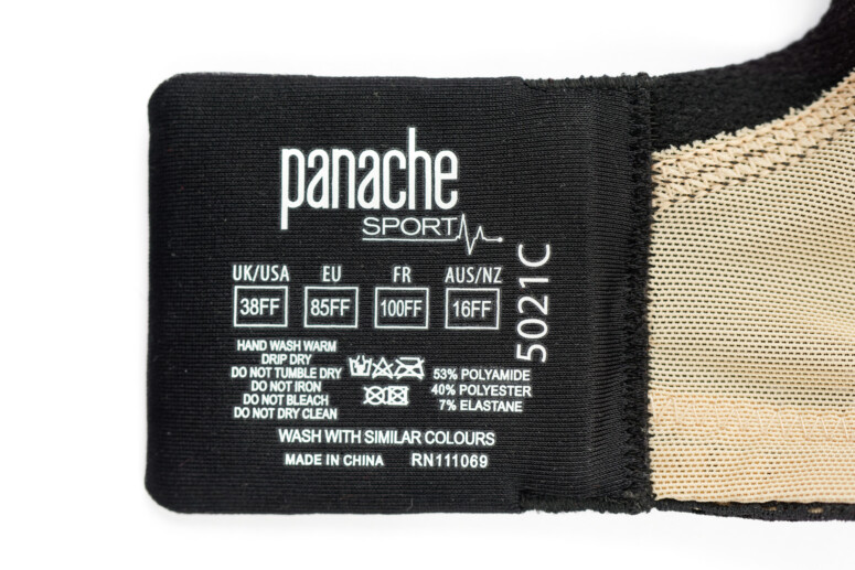 Na początku notki podałam zakres Panache Sporta w rozmiarach brytyjskich (UK), które wyglądają trochę inaczej od tych, do których większość z nas jest przyzwyczajona: UK 28 DD-H, 30 D-H, 32 C-J, 34 B-J, 36 B-HH, 38 B-H, 40 F-GG. Brytyjski rozmiar pod biustem 28 – to tyle, co nasze 60, 30=65, 32=70, 34=75, i tak dalej (tu przeczytacie bardziej szczegółowo o brytyjskiej rozmiarówce). Miseczki do rozmiaru D są takie same, jak nasze, a powyżej są oznaczane: DD-E-F-FF-G-GG-H-HH-J… (podwójne litery to pełne rozmiary, nie żadne „połówki”!). Firma Panache na swoich stronach w wersji polskiej, w tym na stronie marki Panache Sport (znajdziecie tam wszystkie aktualnie dostępne wersje i kolory) „tłumaczy” brytyjskie rozmiary miseczek na europejskie oznaczenia: D-E-F-G-H-I-J-K-L-M-N-O… (co ciekawe, na metce i na staniku miseczki nie są przeliczone). To może być mylące dla Polek, ponieważ miseczki staników polskich firm nie zawsze zgadzają się wielkością z wynikami tego „tłumaczenia”. Innymi słowy, jeśli nosisz w polskiej bieliźnie rozmiar G, to niekoniecznie jest to takie samo G, jakie podaje Panache. Dlatego ja wciąż jeszcze trzymam się brytyjskich oznaczeń w notkach, choć pewnie kiedyś i to się zmieni, gdy powstaną lepiej ustandaryzowane rozmiarówki (ale by było fajnie…). Jeśli potrzebujecie pomocy w ustaleniu swojego brytyjskiego rozmiaru – spokojnie pytajcie mnie w komentarzach, albo przez Kontakt (doradzę).