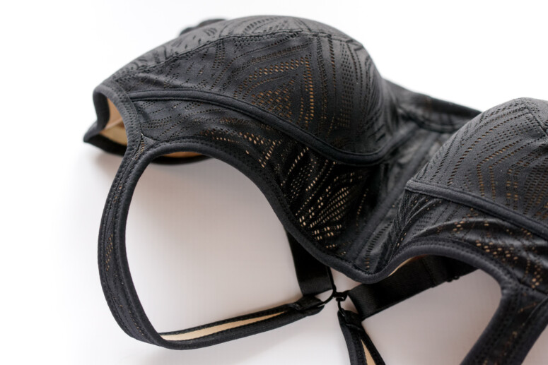 Zacznę od najciekawszego, czyli czym są owe obiecane w tytule „koronki”? Wszystkie modele Panache Sport są od zewnątrz pokryte materiałem – kolorową dzianiną, czasem z dodatkiem wstawek z siatki. W tej wersji pokrycie stanowi czarna dzianina, w której znajdują się różnej wielkości i różnych kształtów otworki. Nie jest ona koronką sensu stricte, przynajmniej na tyle, na ile znam się na materiałoznawstwie (nie jestem specjalistką 😉 ) – lecz właśnie dzianiną z ażurowym wzorem. Przez dziurki „koronki” prześwituje cielisty materiał, tworząc geometryczne wzory, trochę kojarzące się z architekturą, trochę z naturą. Wszystkie elementy stanika, które nie są czarne, są cieliste (beżowe). Wzorek powoduje, że ten bardzo zabudowany model, kojarzący się z napierśnikiem, staje się odrobinę lżejszy optycznie.