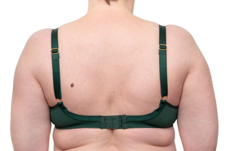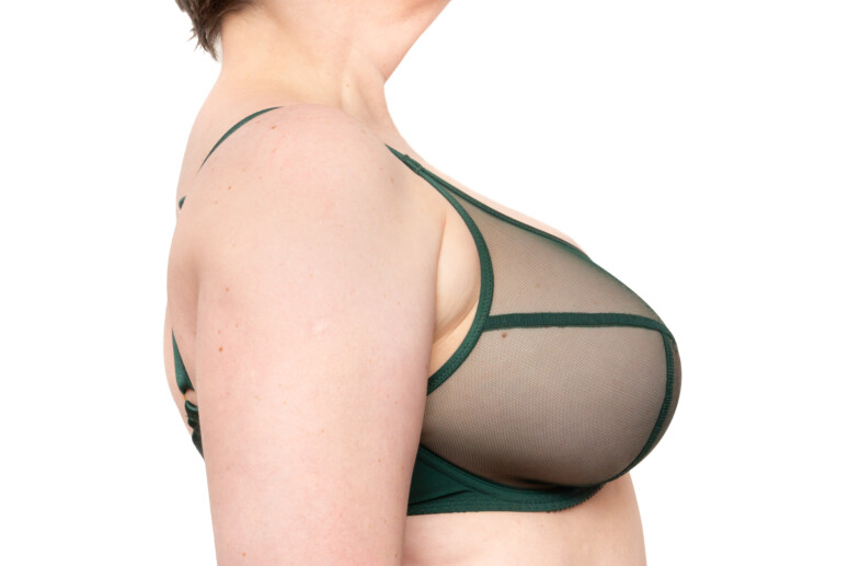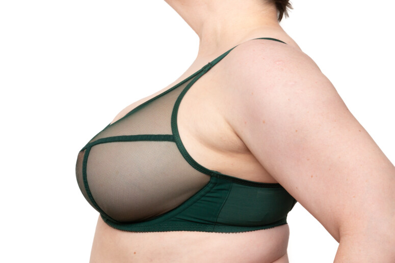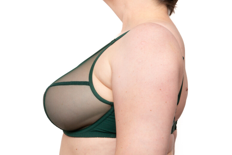 Przedłużone ku ramionom miseczki sięgają wyżej niż w balkonetkach, ale ponieważ nie unoszą mocno piersi, przy ramiączkach nie tworzą się praktycznie puste przestrzenie (strap gaps).