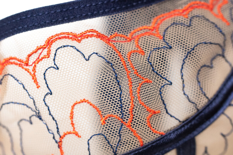 Cały wzór jest przedziwny – ni to płatki kwiatów/liście, ni to obłoczki. Nigdy takiego nie spotkałam. Granatowe kreski są cieniutkie, z pojedynczej nitki, jak narysowane piórkiem. Miejscami te nitki się kończą, albo spotykają z innymi, i widać tam lekkie zaburzenia, które trochę mnie uwierają w oko i nieco odejmują lukśności haftowi, ale może to nie do uniknięcia? Tak czy inaczej, rzecz jest frapująca. Na skórze beżowy tiul przyjemnie znika, widać głównie granatowe tasiemki z połyskującej satyny, które maskują szwy, oraz plątaninę linii.