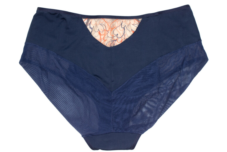 Figi są urodziwe, bo haftu mają dużo, jest nawet wstawka z tyłu, a tył nie jest całkiem kryjący – w sporej części składa się z elastycznego tiulu, złożonego na pół, co daje bezszwowe wykończenie nogawek. Haft jest jednak nieelastyczny, co sprawia, że majtki są trochę ciaśniejsze niż zwykle i w tym kontekście smuci mnie zakres rozmiarów tylko do XXL – czyli miałabym w zapasie jeszcze tylko jeden rozmiar…