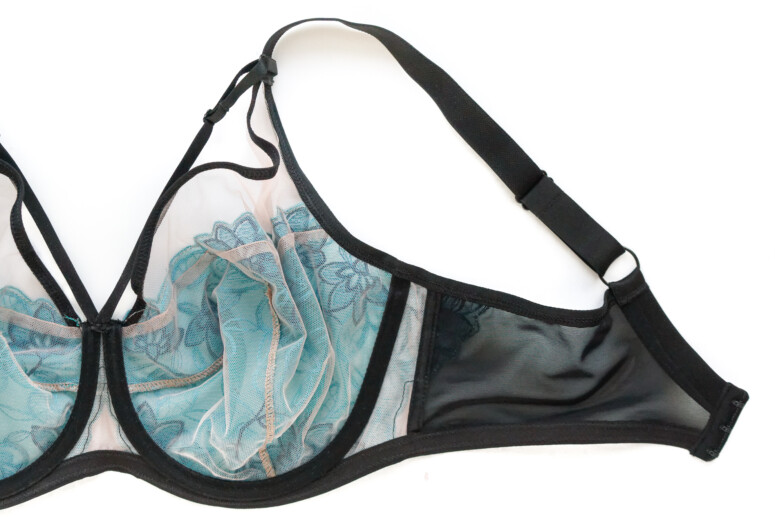 Poza haftem, cieszy mnie w Ruby wyżej wspomniana przejrzystość górnej, tiulowej części miseczki. Z daleka udaje, jakby jej nie było, a biustonosz był half-cupem o poziomej linii dekoltu. Taka konstrukcja ostatnio pojawiła się w ofercie kilku marek w modelach dla dużych biustów, oferując im optyczną namiastkę lekkości niskozabudowanego halfa, przy zachowaniu zabudowania potrzebnego do skutecznego podtrzymania dużych piersi. Osobiście lubię ten pomysł, choć, rzecz jasna, próby skonstruowania half-cupa „prawdziwego” o jak największej rozmiarówce, co niektórym z sukcesem się udaje (np. firmie KrisLine), propsuję najmocniej.