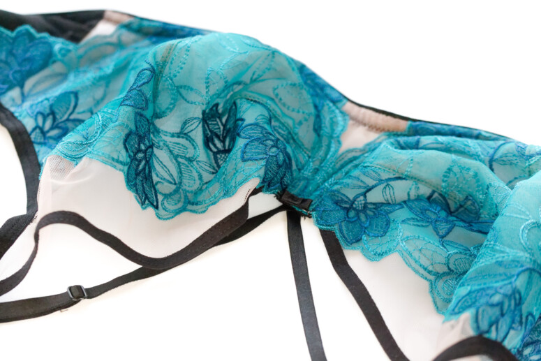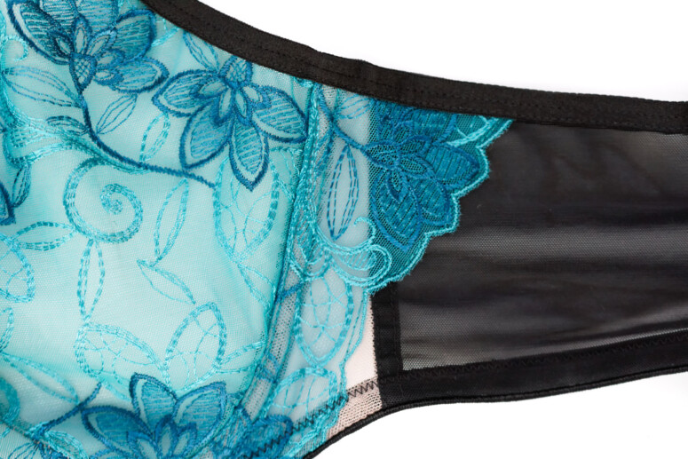 Zacznijmy od koloru – ten turkus to prawdziwy oddech po zalewie czerwieni i czerni z kolekcji jesienno-zimowych 🙂 W dodatku to jedna z moich ulubionych bieliźnianych barw i wiem, że niektóre z was podzielają tę miłość do odcieni zielononiebieskich. Ten haft zresztą zawiera aż dwa odcienie. Jasne i ciemne kwiatowe wzory widnieją na jaśniejszym tle.