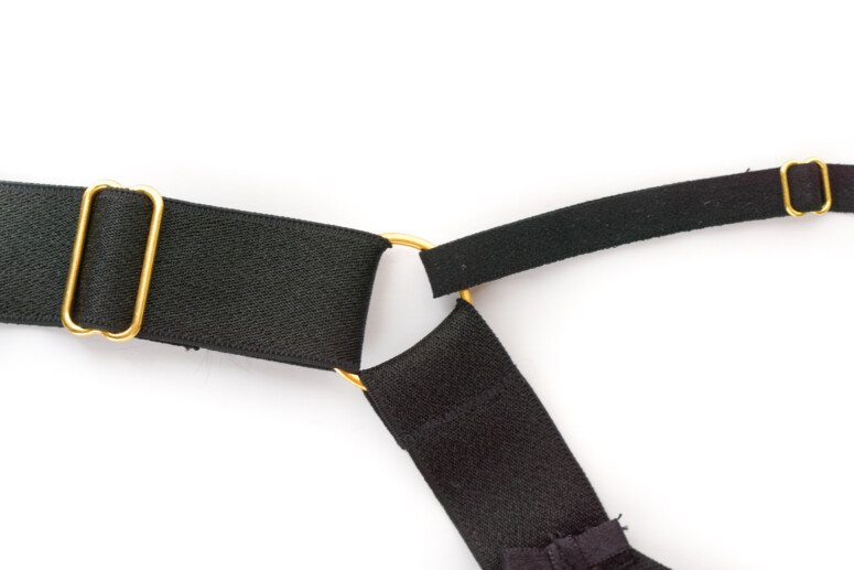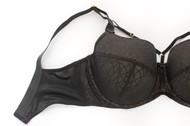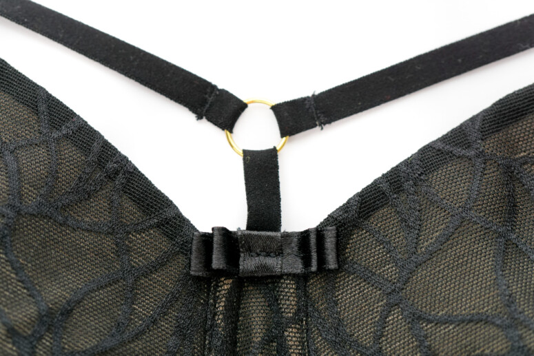 Keila to jeden z tych biustonoszy, w których szczegóły decydują o wszystkim (w sumie to truizm – czyż nie jest tak zawsze? 😉 ) – gdyby odjąć szelki i okucia oraz paseczki z dekoltu, zostałby co prawda graficzny wzór na miskach, ale nie jestem pewna, czy wybrałabym sobie akurat ten model do recenzji. Jak widzicie, oprócz mocowania dla paseczków dekoltowych, z przodu ramiączka jest także jego regulator, co powoduje piękne nagromadzenie metalowych elementów w rejonie przedniej części ramion. Tak, to ramiączko cudnie gra, gdy wystaje ze spuszczonego z jednego ramienia dekoltu (stylówka będzie); robi też, co oczywiste, robotę pod przejrzystymi topami (i jeden taki top nawet należy do linii). Metal ma kolor złoty, co też lubię, bo srebrne kółka już chyba większości z nas się znudziły.