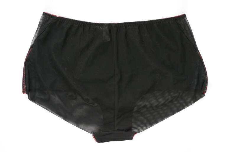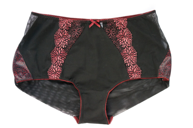Raj dla #teammajtkizgolfem, czyli piękne wysokie figi! Krój jest szortopodobny, czyli mało wyciety na biodrach, w stylu retro. Przypominają mi figi do modelu Clarisse, choć tamte miały w porównaniu z nimi jedną zaletę – były ciekawsze z tyłu. Tutaj prym wiedzie przód – jest i trochę haftu, i wstawki z drukowanej dzianiny. Tył to tiul elastyczny z bezszwowym wykończeniem dołu (złożony na pół) i pionowym szwem. A nie, skłamałam, tył nie jest aż taki nudny – coś się na nim dzieje, a mianowicie mora 😉 Moim zdaniem te majty na żywo wyglądają jednak lepiej niż na zdjęciach.