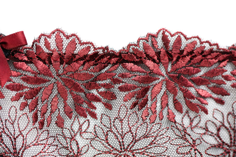 Rzecz jasna, najbardziej oczywiste skojarzenie z tym haftem to kwiaty (chryzantemy?), ale mnie przywodzi na myśl też rozbłyskujące na niebie fajerwerki – a nadruk na dzianinie jeszcze bardziej pasuje do tej interpretacji 😉 Kolor to nieco przygaszony burgund, na hafcie bledszy, na dzianinie głębszy. A na ramiączkach jeszcze pogłębiony ze względu na satynowy połysk. Bardzo zresztą podobają mi się w Cher ramiączka – trochę przyszerokie jak na mój gust, ale naprawdę ładne i z dopasowanymi kolorystycznie regulatorami.