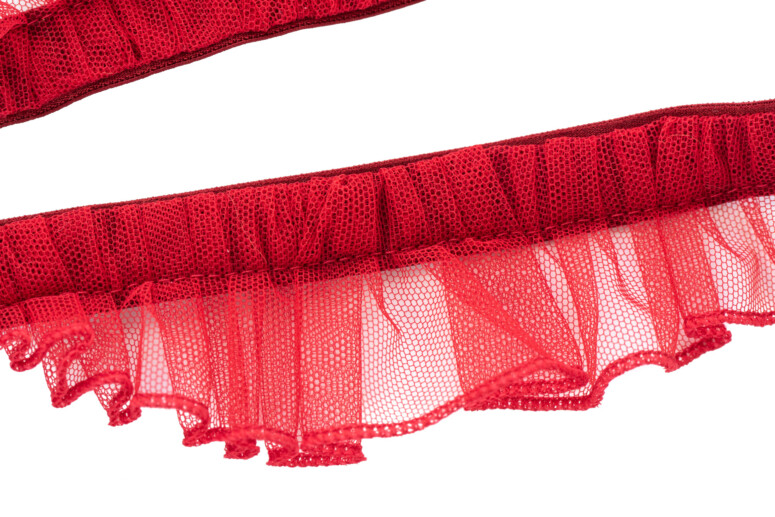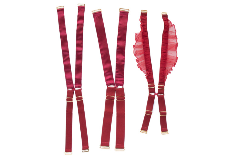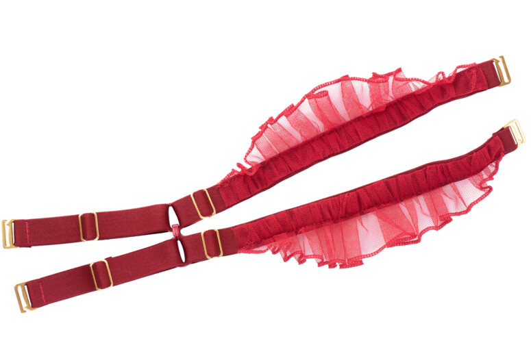 Oprócz tych marszczonych, weszłam w posiadanie również ramiączek z falbanką, oraz gładkich satynowych w dwóch różnych szerokościach (15 i 22 mm). Nie są oferowane w komplecie – trzeba je sobie dokupić (cena jednej pary: 89 zł). Jedyny wariant, jakiego mi brakuje, to mocno poszerzone na ramionach (do 4 cm). W sumie mamy więc do wyboru jedne ramiączka główne, oraz możliwość dokupienia w sumie czterech innych wersji. Wszystkie są równie estetyczne i starannie wykonane. Jedyne, do czego mogłabym się przyczepić – w moim rozmiarze myślę, że falbanki mogłyby być większe i obfitsze ? Mają też nieco inny, jaśniejszy odcień od reszty biustonosza, ale i tak w komplecie prezentują się super.