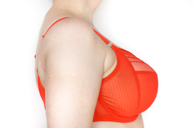 Matilda jest plunge’em, czyli biustonoszem do głębszych dekoltów, o miseczkach w kroju side-support, czyli z bocznym panelem, z którego wyprowadzone jest ramiączko. Część ta jest spora w porównaniu z innymi elementami miseczki. Ten krój u mnie zawsze się sprawdza – a im większy ów panel, tym lepiej.