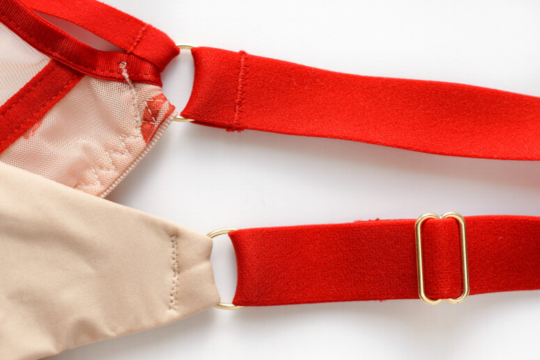 Trochę zaskoczył mnie widok jasnych nitek na czerwonej lamówce na samym środku mostka, ale tym samym ściegiem beżową nicią przyszyte są całe kanaliki fiszbin i rozumiem, że ciężko byłoby zmienić kolor nici w tym miejscu 🙂