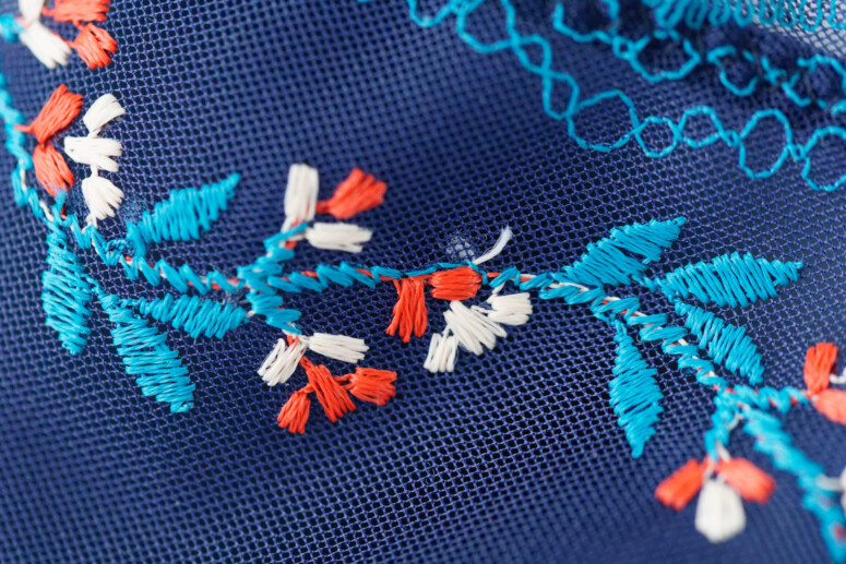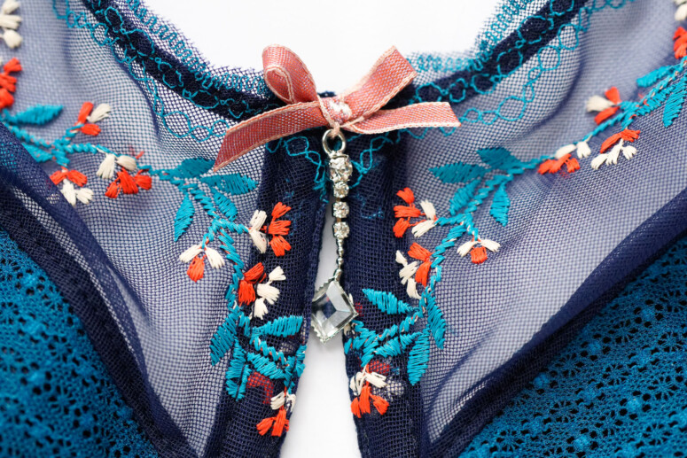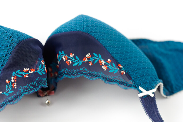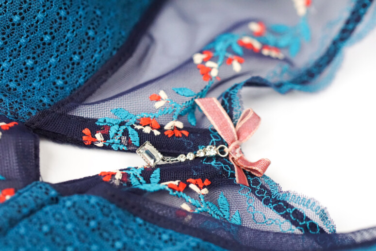 Urodą Lagunka ujęła mnie od razu. Świetna jest ta ciemnoturkusowa, mięsista koronka pokrywająca miseczki i tył, urokliwy jest haft w białe i czerwone, lekko koralowe w odcieniu kwiatki, który aż się prosi o poszukanie podobnych motywów wśród strojów ludowych (tu nie jestem ekspertką, ale ekspertki znam i zapytać nie omieszkam o skojarzenia! 🙂 ). Kokardka ma odcień zgaszonego różu, który nadspodziewanie dobrze harmonizuje z resztą, a do tego jest obecnie w trendzie (makijażowe róże!). Z daleka ta wstążeczka wygląda mi jak aksamitka (i trochę szkoda, że nią nie jest). Zaniepokoiły mnie na początku białe kokardki przy ramiączkach oraz białawe wykończenia gumek dołu i góry, ale z czasem zobaczyłam w tym wszystkim harmonię.