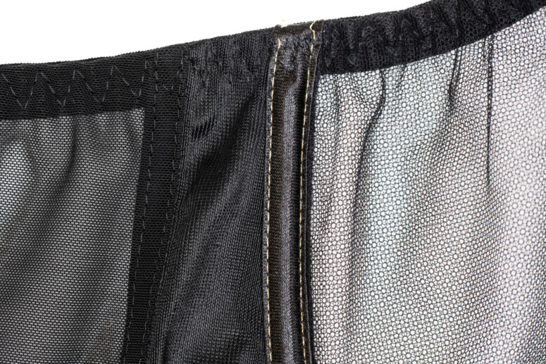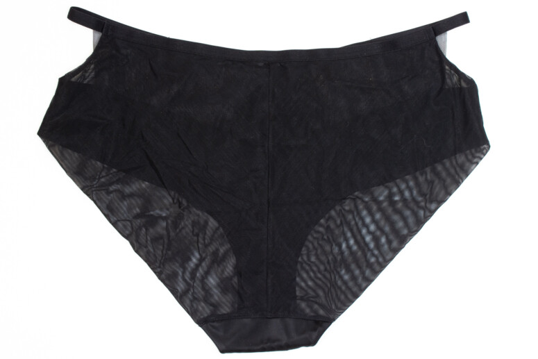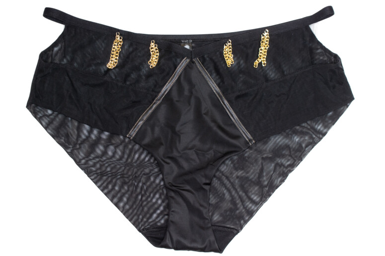 Gatki są szalenie pomysłowe – wycięcia na bokach (nawet fajnie leżą, choć się obawiałam, że nie nadadzą się do brzuchatej sylwetki), trójkątny układ góry, łańcuszki, lamówki, przejrzystości… Dzieje się dużo i fajnie, jestem tylko ciut rozczarowana ich wysokością – na zdjęciach ze szczupłą modelką wyglądają, jakby sięgały po uszy, na moim brzuchu – już nie. To jednak nie są niskie majtki, w każdym razie nie w całości. Góra wycięta w „V” wygląda mega zgrabnie, ale zmniejsza nieco zabudowanie pośrodku – robi „okienko” dla pasa do pończoch, w którym na środku są ozdoby. Mnie podobają się te gatki również bez paska – jak już wspomniałam, to „V” super zgrabnie moim zdaniem wygląda, ale #teammajtkizgolfem podgrupa plus size może być ciut rozczarowany. Tudzież zakres rozmiarów majtek mógłby spokojnie być większy.