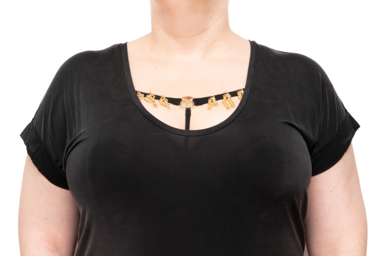 Centralny element z logo jest również dobrej jakości. W ogóle Novika dba o to, by biżuteria była porządna i miła w dotyku; firma zapewnia także, że nie ma zawartości uczulającego niklu. Jestem bardzo ciekawa, jak będzie z trwałością, czy elementy te nie będą z czasem ciemniały. Nie odważam się oczywiście prać ich w pralce. Paseczek dekoltowy nie jest niestety zdejmowalny.